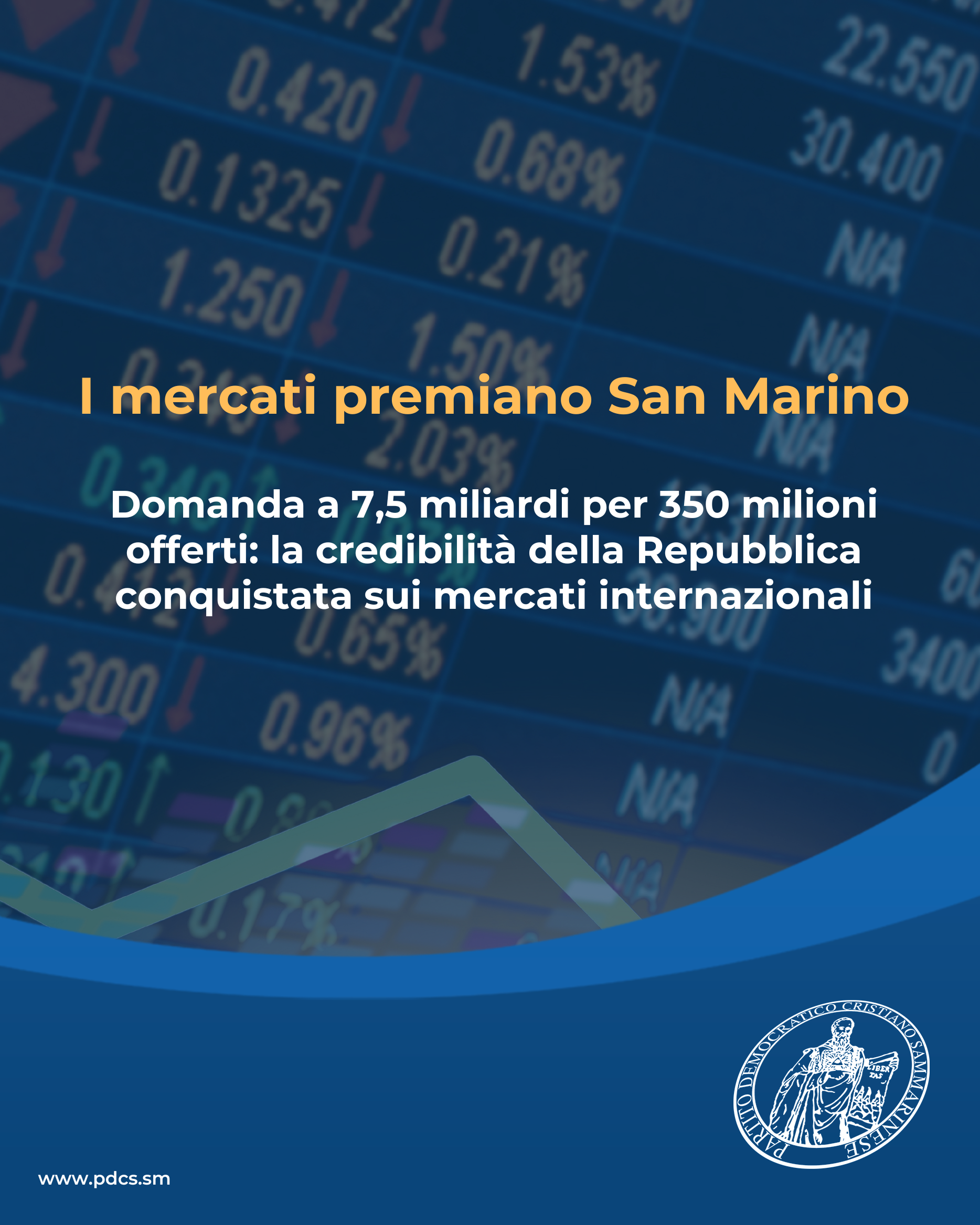 Il Partito Democratico Cristiano Sammarinese esprime grande soddisfazione per l’esito dell’operazione di emissione dei titoli del debito della Repubblica di San Marino, che ha registrato una domanda superiore ai 7,5 miliardi di euro a fronte di un’offerta di 350 milioni di titoli, confermando in modo inequivocabile la fiducia dei mercati internazionali verso il nostro Paese.